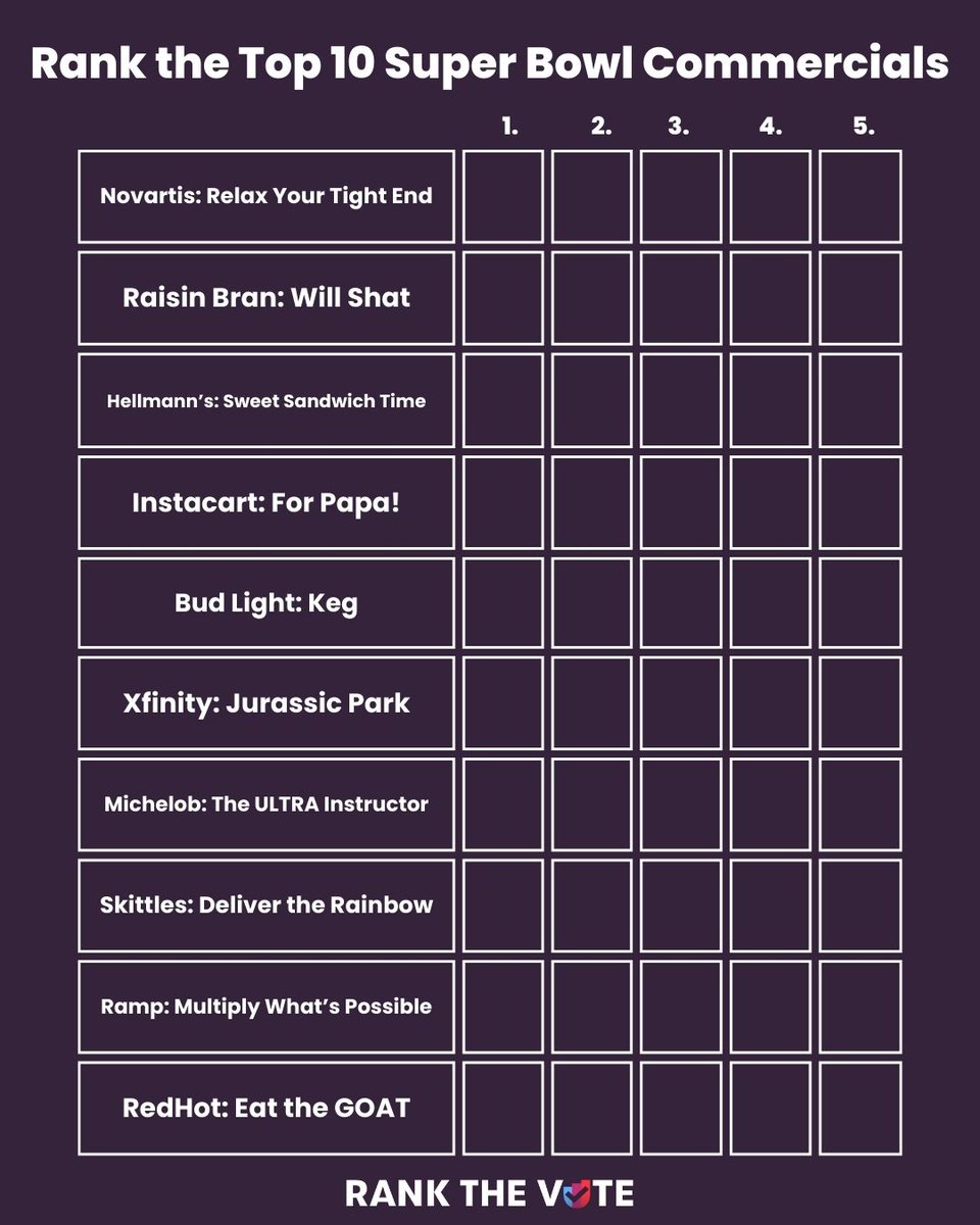 We’re asking you the rank one of the best parts of the Super Bowl…the commercials, of course! Follow this link to rank up to 5 of your favorite commercials: https://app.rankedvote.co/rv/8odczy20dkf38ah48d/vote